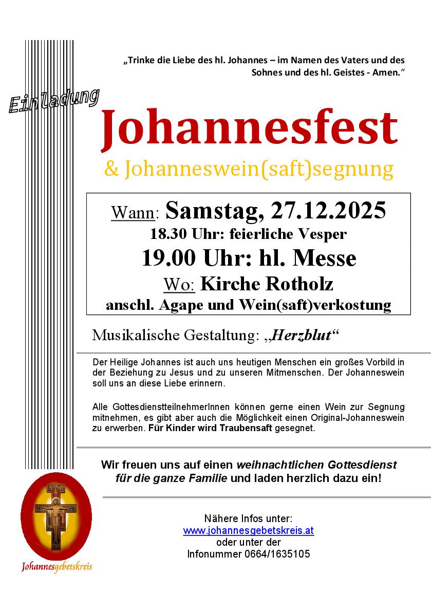 am Samstag, 27.12.2025 laden wir wieder sehr herzlich zum Johannesfest nach Rotholz!